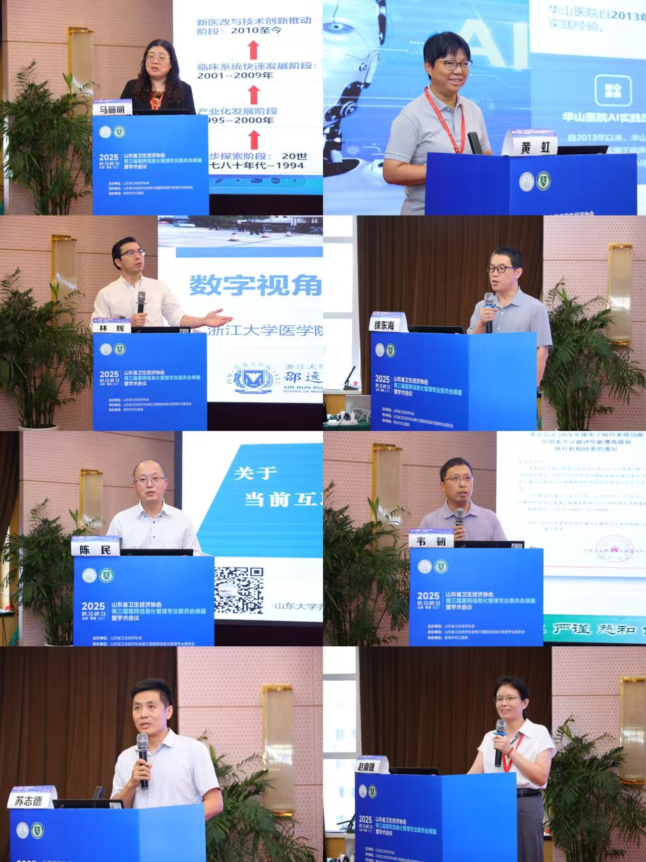 换届选举后,会议进入学术交流环节。佛山市妇幼保健院信息中心主任马丽明、复旦大学附属华山医院大数据中心主任黄虹、浙江大学医学院附属邵逸夫医院互联网与人工智能办公室主任林辉、山东省健康医疗大数据管理中心运营安全管理部副部长徐东海、山东大学齐鲁第二医院互联网医院管理办公室主任陈民、山东第一医科大学第一附属医院信息中心主任韦韧、潍坊市人民医院副院长苏志德、青岛市市立医院信息与大数据管理部副主任赵鼎婕分别以《监管视角下的数智化项目建设合规风险》《医院人工智能发展规划及应用》《数字化重构医疗服务生态》《从工信部行政执法事项清单,看如何落实行业网络安全工作》《关于当前互联网医院服务模式的探讨》《智慧医院建设应用与实践》《智慧医疗・智能医技・质控安全——AI驱动医院管理变革三维创新实践》《数据驱动下的医院质量安全管理多场景落地实践与成效》为主题进行了学术分享。