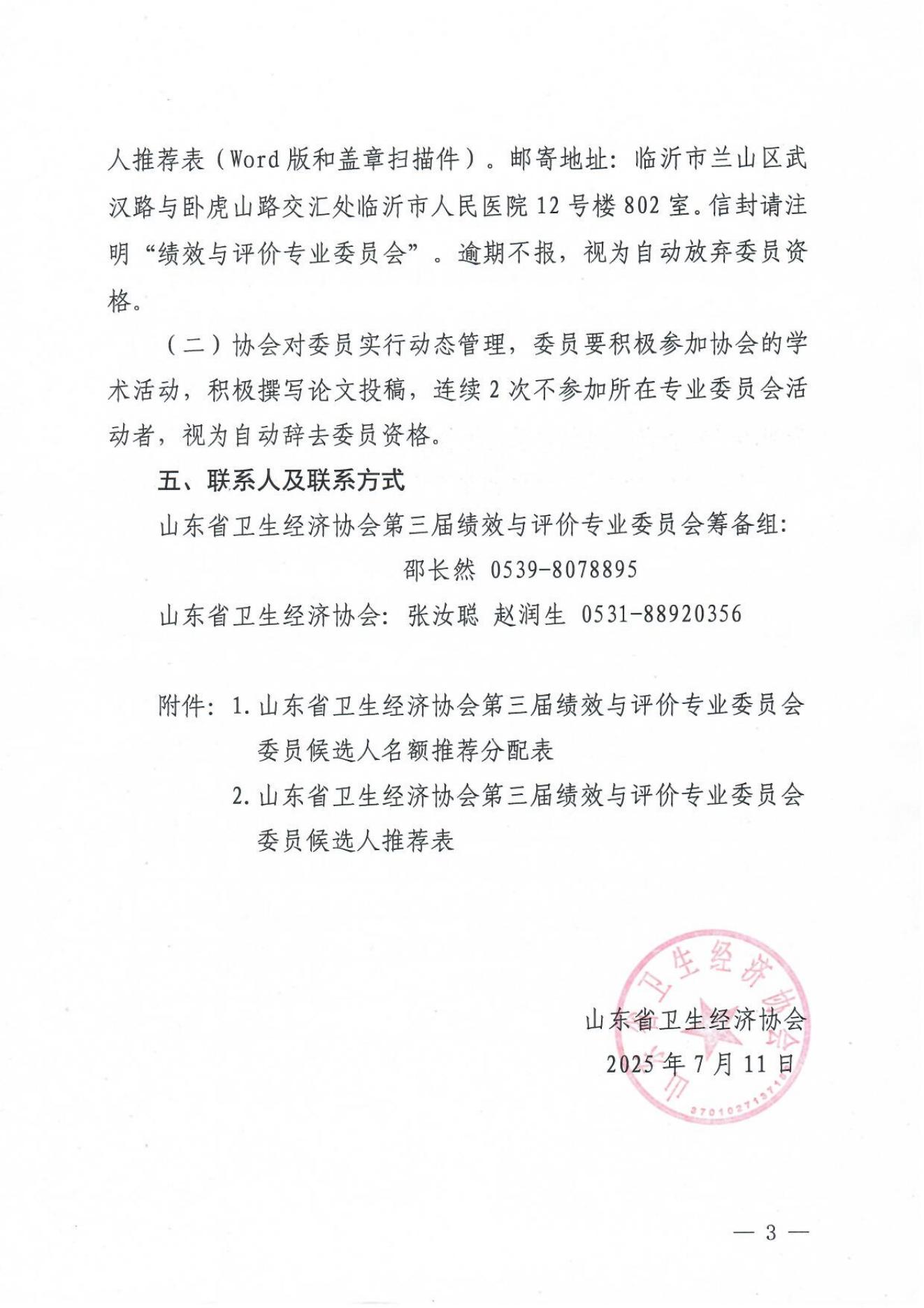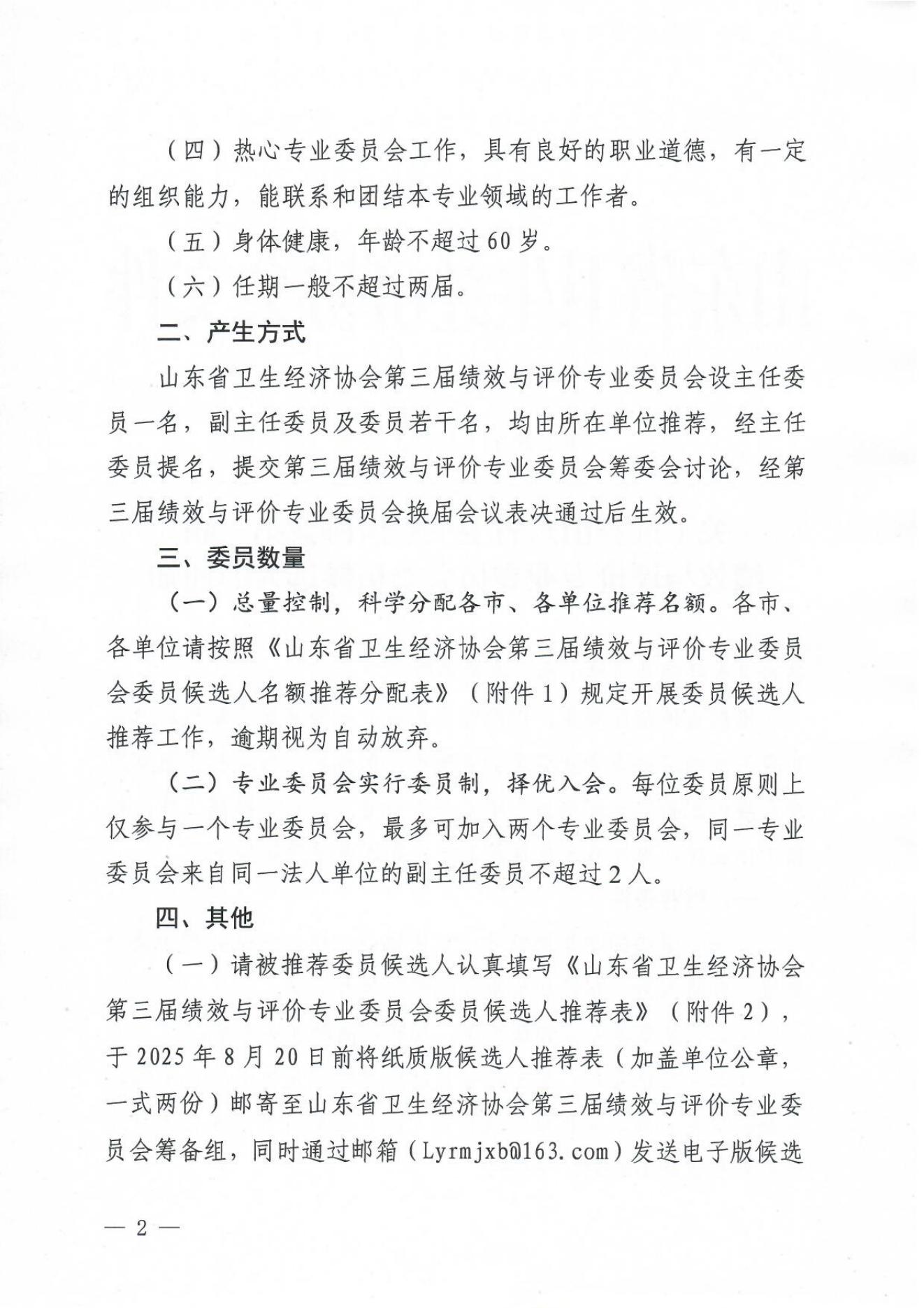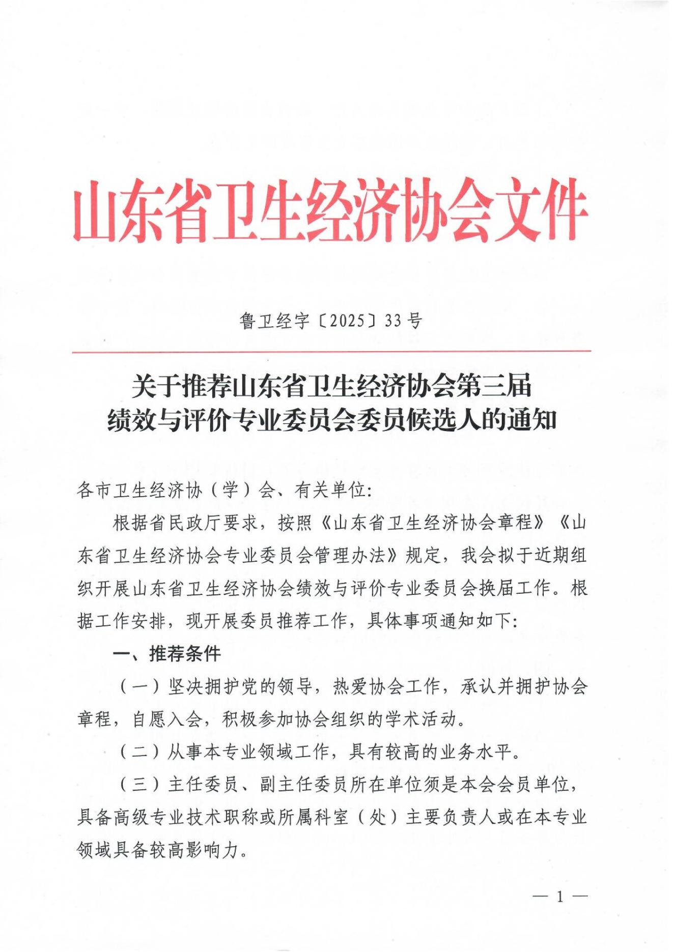 鲁卫经字【2025】33号 关于推荐山东省卫生经济协会第三届绩效与评价专业委员会委员候选人的通知.pdf