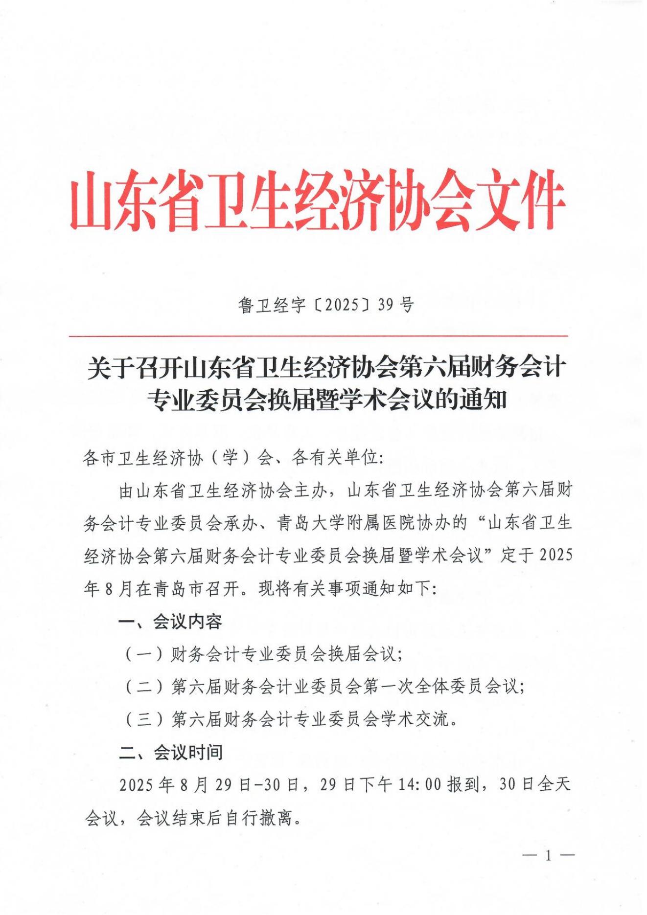 鲁卫经字【2025】39号 关于召开山东省卫生经济协会第六届财务会计专业委员会换届暨学术会议的通知.pdf